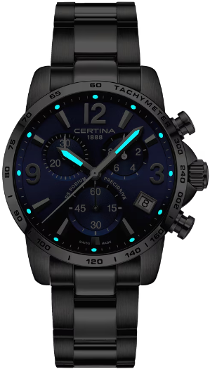 Современная интерпретация классики. Это новое издание популярной модели DS Podium Хронограф с кварцевым механизмом Precidrive, возможностью измерять десятые доли секунды в режиме реального времени, а также впечатляющим 41 мм корпусом создано для ещё большей точности и спортивной элегантности. Для корпуса, браслетов и застежек своих часов марка Certina использует нержавеющую сталь 316L, отличающуюся повышенной износостойкостью, устойчивостью к коррозии и гигиеничностью. В стали содержится совсем небольшое количество никеля, поэтому этот материал не вызывает аллергии при носке. Super-LumiNova (SLN) представляет собой cветящийся материал с фосфоресцирующими свойствами. В темноте SLN типа BG W9, который использует Certina, испускает свет в виде голубого мерцания. SLN не вредит здоровью и используется для нанесения на стрелки, индексы и безели. В темноте он через некоторое время теряет свои фосфоресцирующие свойства, но они автоматически восстанавливаются на свету. Сапфировое стекло состоит из порошка оксида алюминия (Al2O3), раскаленного до 2.000 C. Получаемые в результате сапфировые пласты нарезаются на тонкие пластины, им придают требуемую форму и полируют. Сапфир абсолютно прозрачен, обладает высокой устойчивостью к царапинам и механическим повреждениям. По этим причинам сапфировое стекло стало неотъемлемой деталью концепции DS и используется во всех моделях Certina для защиты циферблата. Вес нетто 142 гр. Водонепроницаемость 10 бар (100 м). Диаметр корпуса 41 мм. Толщина 11.83 мм. Между креплениями 20 мм. Кварцевый хронограф ETA G10.212 на 1/10 секунды (в режиме реального времени) на 30 минут. Счетчик десятых долей секунды повышает престижность любого хронографа: Некоторые модели Certina имеют этот счетчик на дополнительном циферблате у отметки «2 часа». Счетчик активируется нажатием кнопки и автоматически останавливается по истечении минуты, хронограф же продолжает отсчитывать время с точностью до десятой доли секунды. PrecidriveTM - Название инновационной технологии, обеспечивающей исключительную точность хода изделий Certina: Точность часов с кварцевым калибром Precidrive может сравниться с хронометрами. Часы Precidrive с погрешностью до +/-10 секунд в год в 8–10 раз точнее обычных кварцевых часов. Некоторые кварцевые часы Certina – как, например, все модели Precidrive, будь то вариант с тремя стрелками или хронограф – имеют указатель окончания срока службы элемента питания (EOL). Эта функция позволяет узнать, когда завершится срок службы элемента питания: В этом случае секундная стрелка движется с интервалами в 4 секунды, и элемент питания необходимо заменить в течение двух недель.