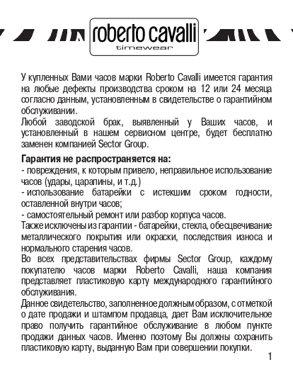На все часы Roberto Cavalli, которые Вы приобретаете в салонах или интернет магазине Mystery Time, действует 2-х летняя международная гарантия производителя. В случае возникновения гарантийного случая, Вам необходимо обратиться по адресу, указанному в гарантийном талоне. Обращение в любой другой сервисный центр аннулирует Вашу официальную гарантию.